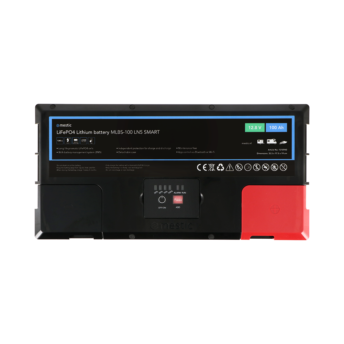 MLS-100 LN5 smart er et 100Ah litiumbatteri udstyret med LiFePO4-celler af høj kvalitet, der giver topydelse og lang levetid. Det integrerede batteristyringssystem (BMS) beskytter løbende batteriet mod overopladning, overophedning og dyb afladning. Takket være den indbyggede varmefunktion kan du endda oplade batteriet i temperaturer ned til -20 °C. Batteriet holder også ekstra længe med mere end 3500 opladningscyklusser ved 100 % afladning.