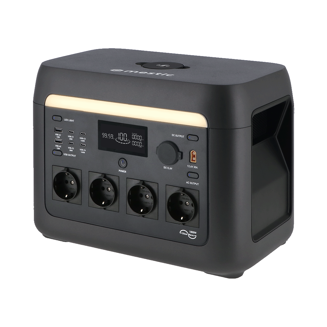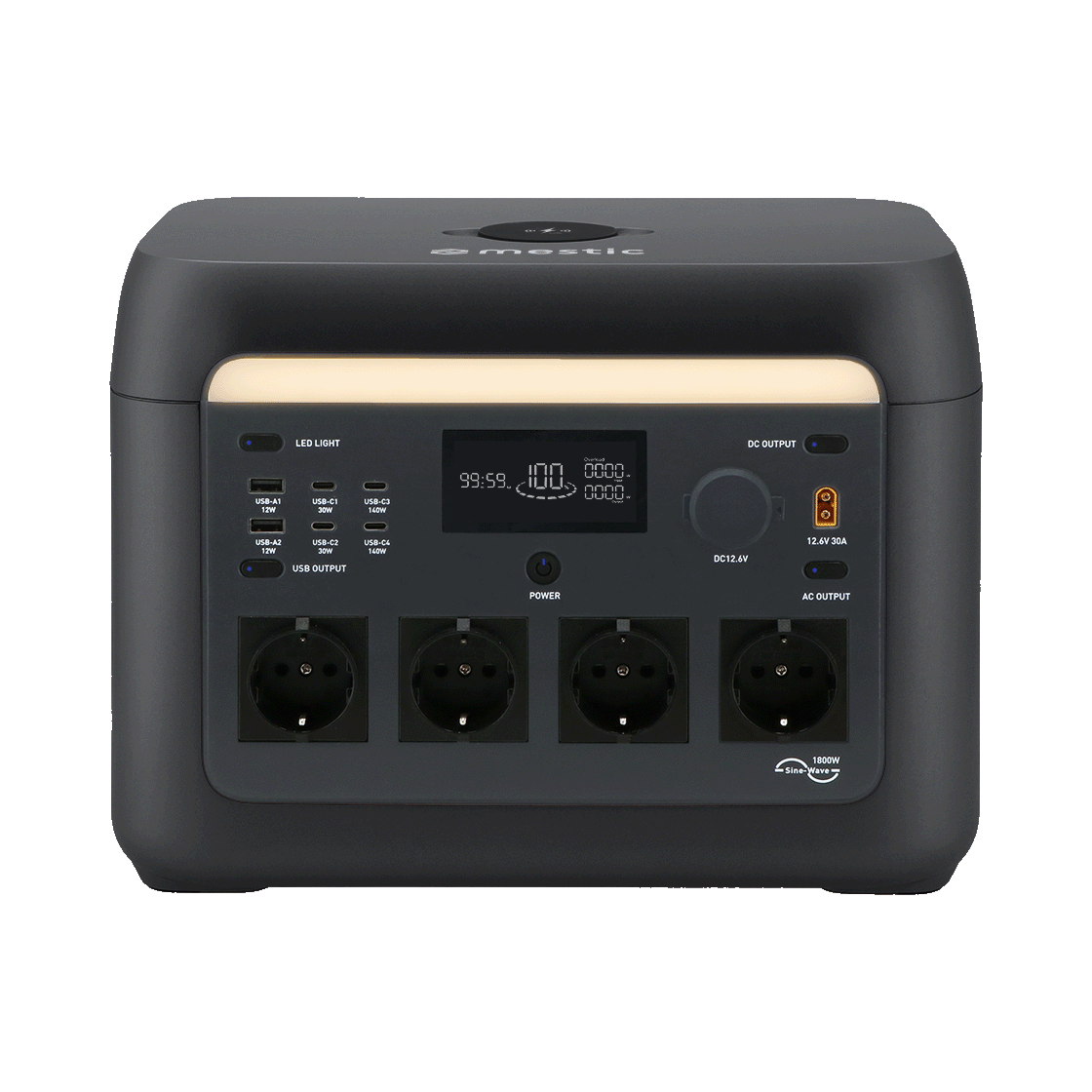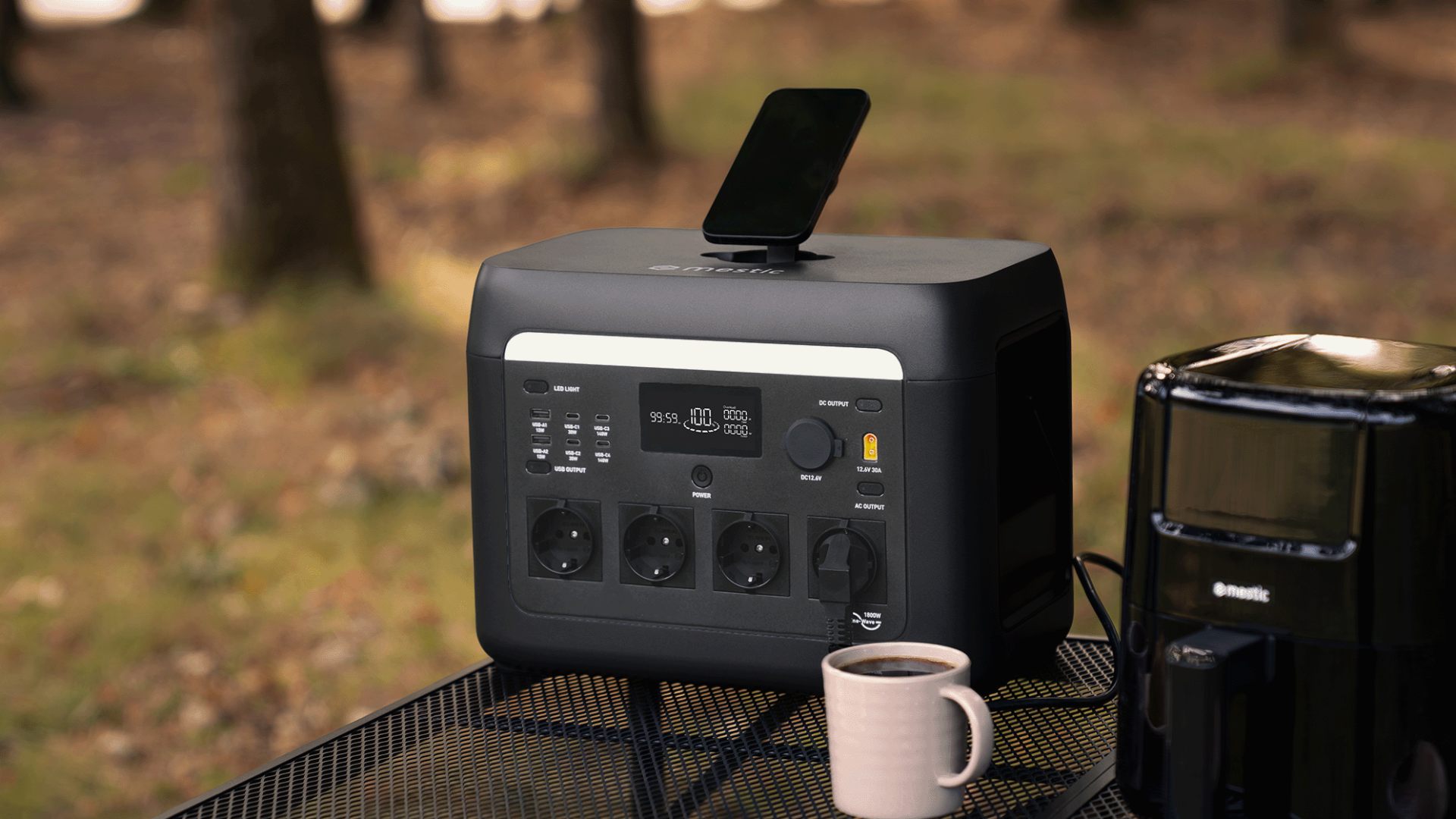 MPS-1800x er en kraftfuld strømkilde med en effekt på 1800 W. Dette giver nok energi til timevis af brug med hverdagens enheder. Det gør strømstationen ideel til en campingtur i vildmarken, men også til brug derhjemme som en ekstra strømkilde. Strømstationen har 4 AC-stik, 2 DC-porte, 2 USB-A- og 4 USB-C-porte, så du kan tilslutte en telefon, tablet eller endda en kaffemaskine og andre husholdningsartikler. På toppen af enheden finder du også en praktisk trådløs Qi2-oplader (op til 25 W) til hurtig, trådløs opladning af din telefon. Ved hjælp af Mestic-appen kan du nemt styre strømstationen fra din smartphone via Bluetooth eller Wi-Fi. I appen kan du med et enkelt blik se det aktuelle forbrug, den samlede indgangseffekt, batteristatus og meget mere.